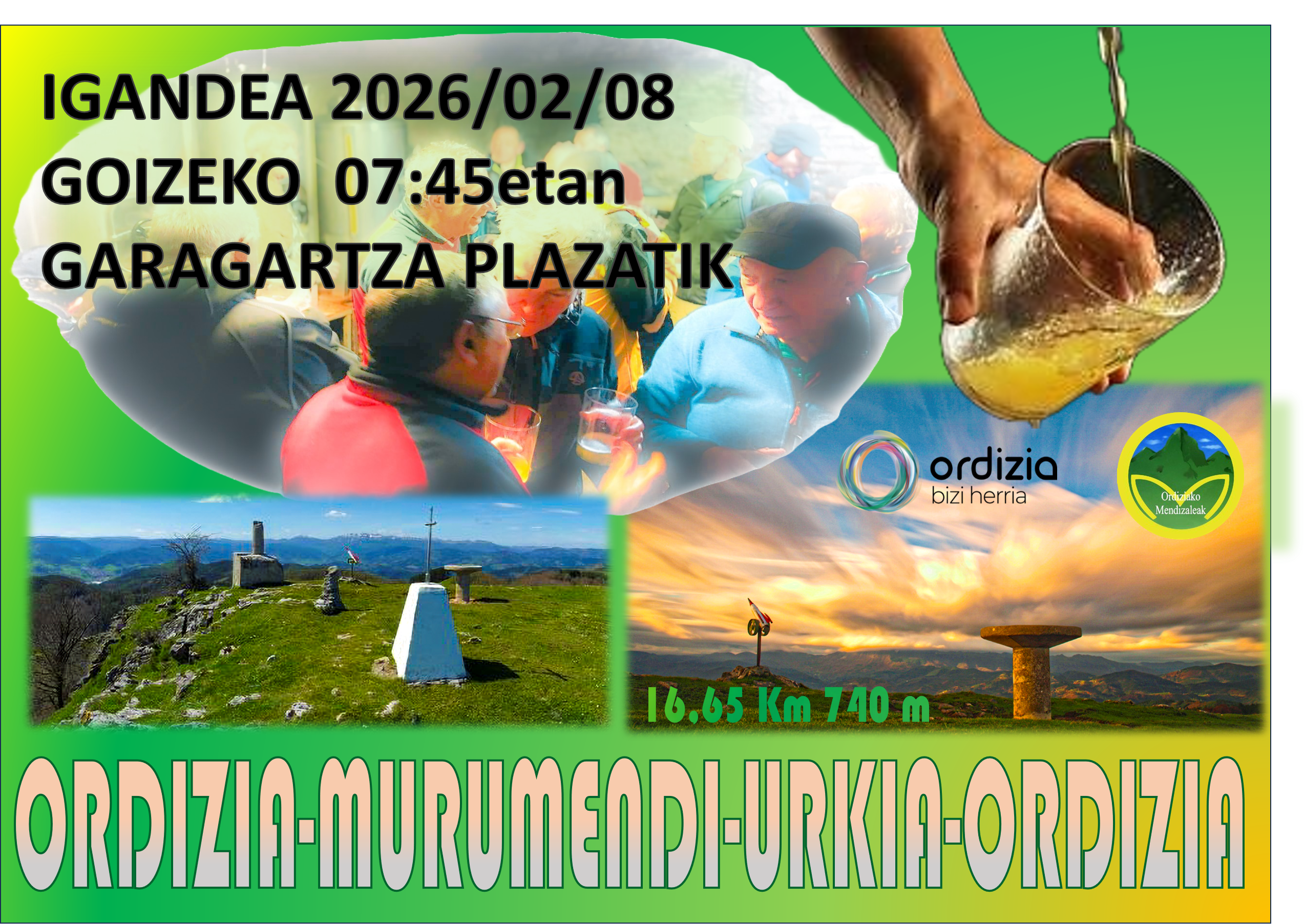 Próxima salida montañera: Ordizia - Arramendi - Ioia - Murumendi - Urkia - Potxo - Ordizia. Distancia aproximada: 16,6 kilómetros. Desnivel aproximado: 740 metros. Hora de salida: 7:45 de la mañana desde la Prazuela.