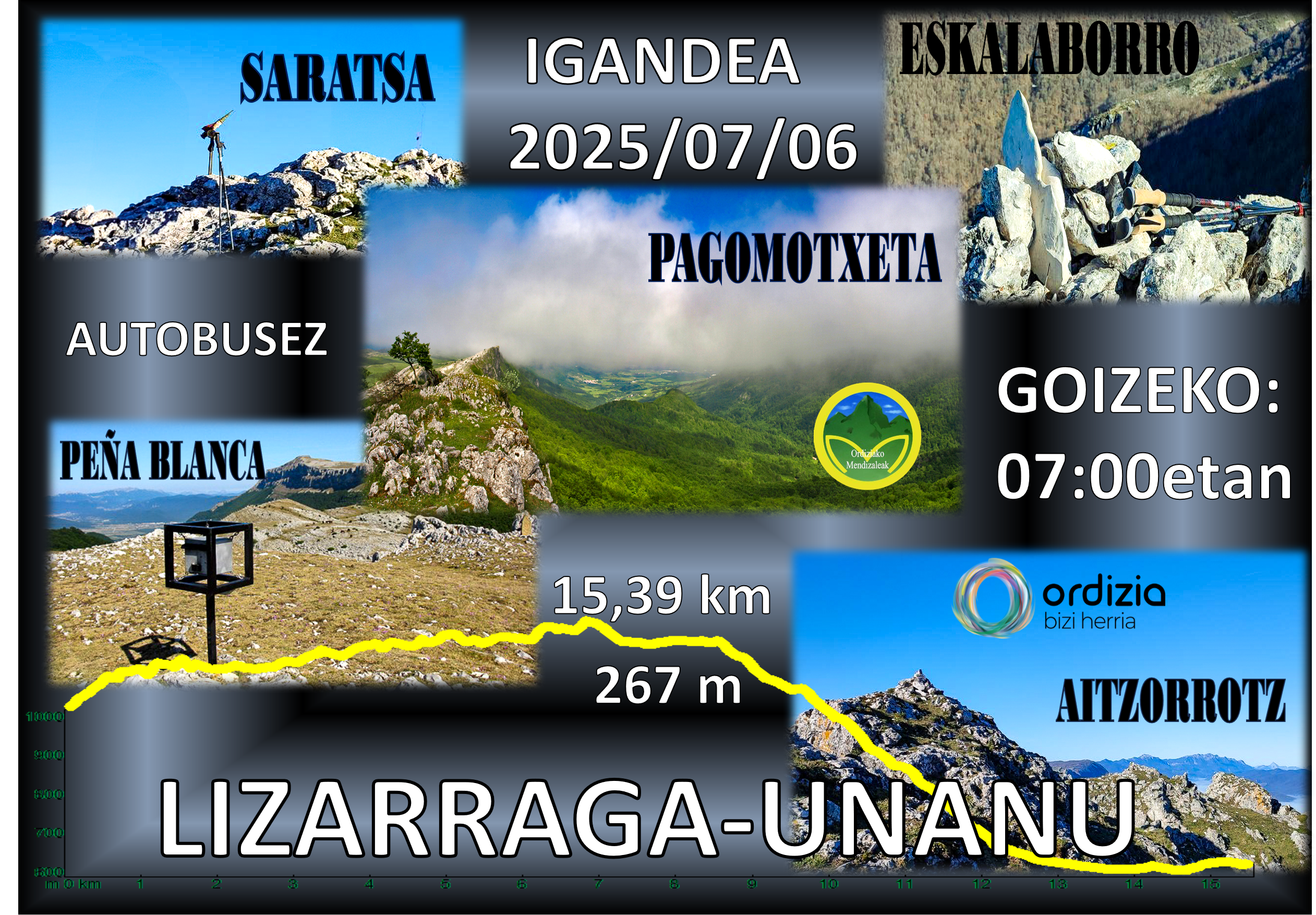 Uztailaren 6rako, igandea, mendi irteera. Programatutako irteera baieztatu da: Lizarraga - Unanu, 15,5 kilometro inguruko distantziarekin, 250 metro inguruko desnibel positiboarekin eta 670 metroko desnibel negatiboarekin, gutxi gorabehera.
